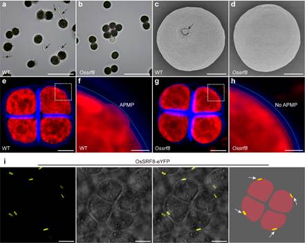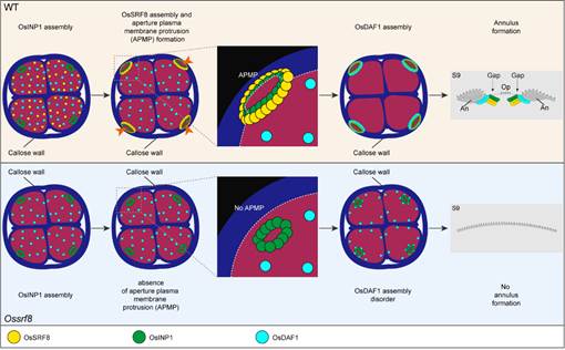 本研究鉴定到一个新的控制萌发孔形成的关键基因OsSRF8(STRUBBELIG-receptor family 8)。OsSRF8属于富亮氨酸重复类受体激酶LRRⅤ亚家族成员,且OsSRF特异存在于禾本科作物。融合互补实验结果显示,OsSRF8极性聚集于四分体小孢子远极端区域。OsSRF8参与调控萌发孔质膜凸起的产生(APMP),从而指导水稻花粉萌发孔的形成。