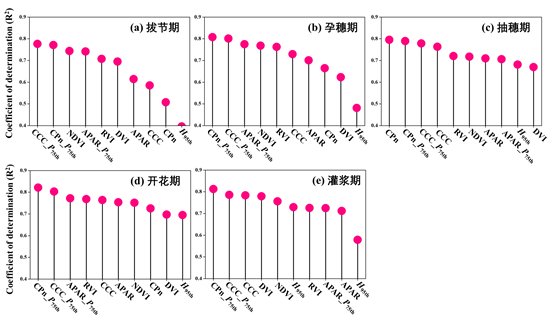 图3 各参数在不同生育期对产量的估测能力