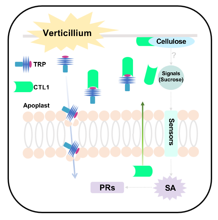 质外体蛋白CTL1阻止新型毒蛋白VdTRP破坏细胞膜,诱导植株提高免疫,增强棉花对黄萎病抗性的工作模式图