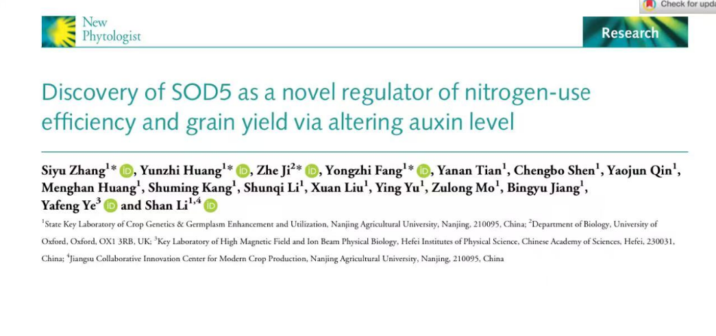 《New Phytologist》发表李姗教授团队“Discovery of SOD5 as a novel regulator of nitrogen use efficiency and grain yield via altering auxin level”
