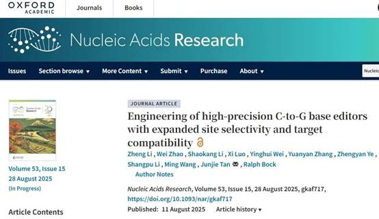《Nucleic Acids Research》发表谭俊杰教授团队“Engineering of high-precision C-to-G base editors with expanded site selectivity and target compatibility”