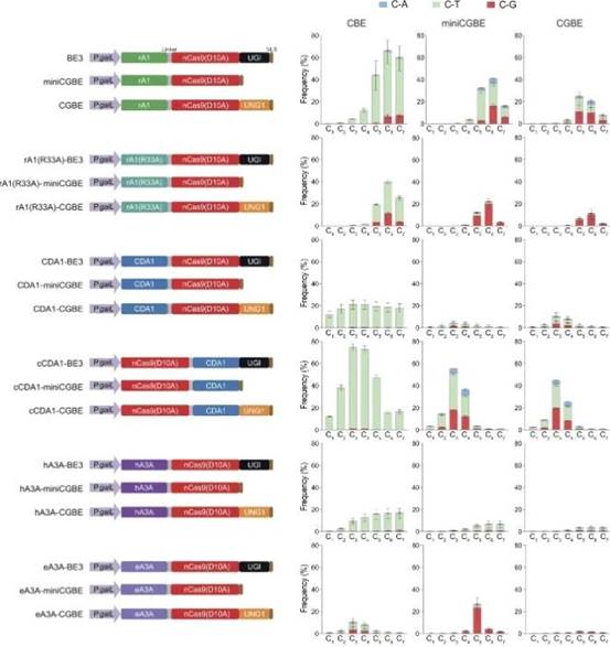 自 2016 年以来,人们开发出了 CRISPR 碱基编辑器 (BE),它涉及催化受损的 Cas 核酸酶与核苷脱氨酶的融合。这使得引入点突变而无需供体 DNA 模板,也不会在目标 DNA 中造成 DSB。当前的 BE 主要实现同一组核苷酸内的碱基转换(即嘧啶到嘧啶或嘌呤到嘌呤的替换)。例如,可以使用胞嘧啶碱基编辑器 (CBE) 完成 C 到 T 的替换,而使用腺嘌呤碱基编辑器 (ABE) 完成 A 到 G 的转换。最近,建立了一种新型 BE,称为 C 到 G 碱基编辑器 (CGBE),它包含 Cas9 切口酶 (nCas9)、脱氨酶,有时还包括额外的尿嘧啶 DNA N-糖基化酶 (UNG)。特异性是通过将 gRNA 的 20 个核苷酸原型间隔序列与互补目标 DNA 精确配对来实现的,形成 R 环结构,然后脱氨酶将非目标链上的胞嘧啶转化为尿嘧啶,然后进行处理以生成所需的 C 到 G 碱基变化。尽管已经通过脱氨酶工程和/或与额外碱基切除修复 (BER) 蛋白融合做出了巨大努力来提高编辑效率和产品纯度(即所有编辑等位基因中仅包含所需编辑的比例),但目前可用的 CGBE 在其编辑范围方面受到严重限制,因为它们相对于原型间隔相邻基序 (PAM) 的远端选择性地编辑原型间隔内的位置 。此外,它们的有效性在很大程度上依赖于 DNA 底物的序列环境,表现出对富含 AT 的序列环境的强烈编辑偏好,这严重限制了 CGBE 的潜在应用范围。