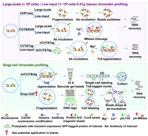 该综述总结了低样品量/单细胞水平下鉴定全基因组染色质修饰的方法,并比较了基于ChIP-seq 以及CUT&RUN/Tag鉴定方法在哺乳类动物和植物的应用进展及生物学意义;概括了这些方法在植物中的应用优势;展望了该领域未来研究所面临的挑战,为后续相关研究提供了新的策略和启发。该方法在植物中的应用,可以使我们更全面、系统地了解那些数量有限且具有特殊生物学功能细胞中的染色质调控,如减数分裂细胞的发育过程、顶端分生组织细胞的起始和分化等。