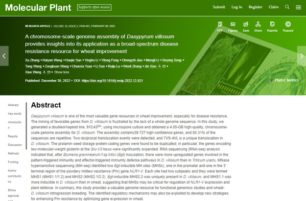 《Molecular Plant》上发表王秀娥教授团队“A chromosome-scale genome assembly of Dasypyrum villosum provides insights into its application as a broad-spectrum disease resistance resource for wheat improvement”