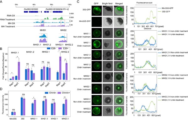 为揭示Pm21(NLR1-V)广谱高抗白粉病的表观基因组学基础,利用MH-seq技术鉴定簇毛麦全基因组水平受白粉菌诱导的开放染色质位点(MHSs),在Pm21基因启动子区域和3'UTR末端区域分别鉴定一个受白粉菌诱导富集的MHSs:MHS1和MHS2,分别包含两个亚峰即MHS1.1和MHS1.2以及MHS2.1和MHS2.2(图2)。原生质体瞬时转化实验发现MHS1/MHS1.1和MHS2/MHS2.2均可以驱动报告基因GFP的表达,并且在几丁质处理后,其驱动活性增强,证明MHS1.1和MHS2.2可能作为核心调控元件,调控Pm21的表达,在抗白粉病中发挥重要作用。