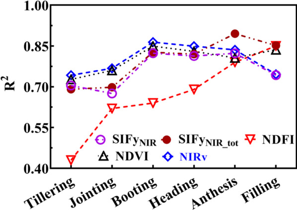 本研究评估了小麦不同关键生育时期和不同时间尺度的SIF参数[SIFyNIR、SIFyNIR_tot、NDFI]估测小麦产量的效果,明确了基于SIF估测小麦产量的最优参数和最佳生育时期,并与基于反射率的植被指数[近红外处植被反射率(NIRv)、归一化植被指数(NDVI)]估测效果进行对比。结果表明,所有参数中,开花期的SIFyNIR_tot与小麦产量的相关性最好。相比植被指数,SIFyNIR_tot在开花期和灌浆期估测产量的效果更好。