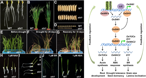 研究人员前期鉴定了一个新的水稻株型发育突变体shi1(short internode1),并克隆了调控基因OsSHI1。本研究发现shi1突变体具有多种典型的与植物激素相关的表型变异:如根部发育迟缓、重力响应及对生长素(auxin)敏感性降低等,株型紧凑、籽粒变小及对油菜素内酯(BR)不敏感等,种子萌发降低、耐逆性增强及对脱落酸(ABA)高度敏感等。激素含量测定结果表明,shi1突变体中auxin及BR前体物质的含量显著降低。Auxin及BR合成相关基因如OsYUCCAs和D11以及ABA信号调控基因OsNAC2在shi1突变体中均显著下调。酵母单杂交、ChIP-qPCR及EMSA等实验证实OsSHI1可直接结合上述基因的启动子并激活其表达。此外,OsSHI1的表达也受植物激素调控,如auxin及ABA促进而BR则抑制OsSHI1的表达。OsSHI1启动子区存在多种激素途径相关转录因子如ARF、ZIP及LIC等的结合位点,这些转录因子可直接结合OsSHI1的启动子,进而调控其表达,且OsSHI1也可直接抑制自身基因的转录活性。综上,OsSHI1通过整合多种植物激素的信号转导与生物合成的反馈作用,协同调控水稻生长及耐逆过程,这些结果对植物株型及耐逆性改良具有重要指导意义。