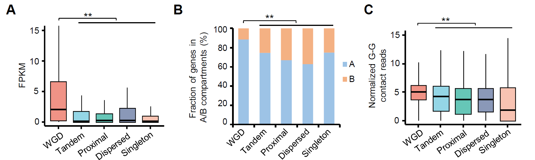 图1: 染色质互作参与全基因组重复基因的表达调控