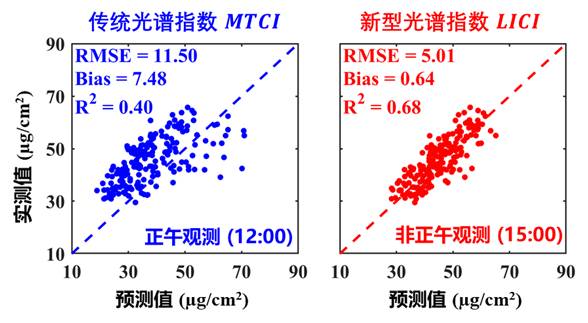 该研究基于作物辐射传输模型模拟了大量光照场景下的冠层反射率光谱,并结合多生态点稻麦田间小区试验数据,系统解析了已有光谱指数对叶绿素含量与冠层结构的敏感性,创建了双指数差值数学组合形式的对冠层叶面积指数不敏感叶绿素指数LICI(Leaf area index Insensitive Chlorophyll Index),并在此基础上构建了具有普适性的叶片叶绿素含量高精度估算模型。此外,针对农田土壤背景对作物生育前期冠层光谱的干扰问题,通过时间序列冠层光谱模拟分析,提出了一种新的光谱观测模式—非正午观测,不同于目前普遍采用的正午观测,从而可有效避免农田土壤背景对叶绿素含量估算的影响。应用新型光谱指数LICI和非正午光谱观测模式,典型稻麦作物叶绿素含量估算误差最低可达5.01µg/cm2,显著低于传统光谱指数(如MTCI)和正午光谱模式(估算误差为11.5 µg/cm2)。该研究揭示了冠层结构和观测时间(或太阳位置)对叶绿素光谱监测的影响机理,为拓展田间光谱测试的时间窗口提供了重要依据,对于作物叶片叶绿素含量的高通量智能化监测和全球大面积空间制图具有重要的应用价值。