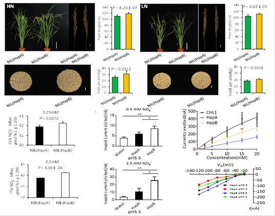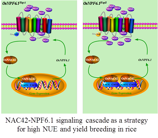 该研究通过基于三年大田试验的基因组关联分析,结合过表达和基因敲除等功能验证,克隆了双亲和硝酸根转运子OsNPF6.1,发现OsNPF6.1的优异单倍型增强氮素吸收和提高NUE,进而提高水稻在低氮下的产量。电生理和调控机制研究阐明了OsNPF6.1的优异自然变异及其增强NUE的分子机制。同时,该研究还鉴定了一个新颖的调控水稻氮高效的转录因子OsNAC42,该转录因子结合OsNPF6.1启动子上的CACG元件,并导致激活OsNPF6.1的表达差异。后续的基因功能和调控网络的解析正在深入展开,对破译植物耐低氮性状的遗传基础研究具有重要的科学意义。