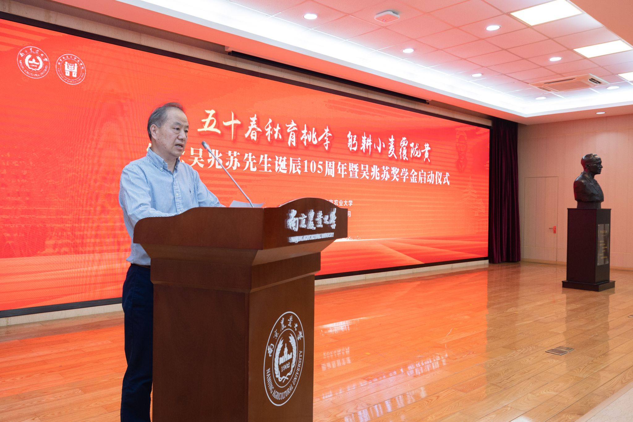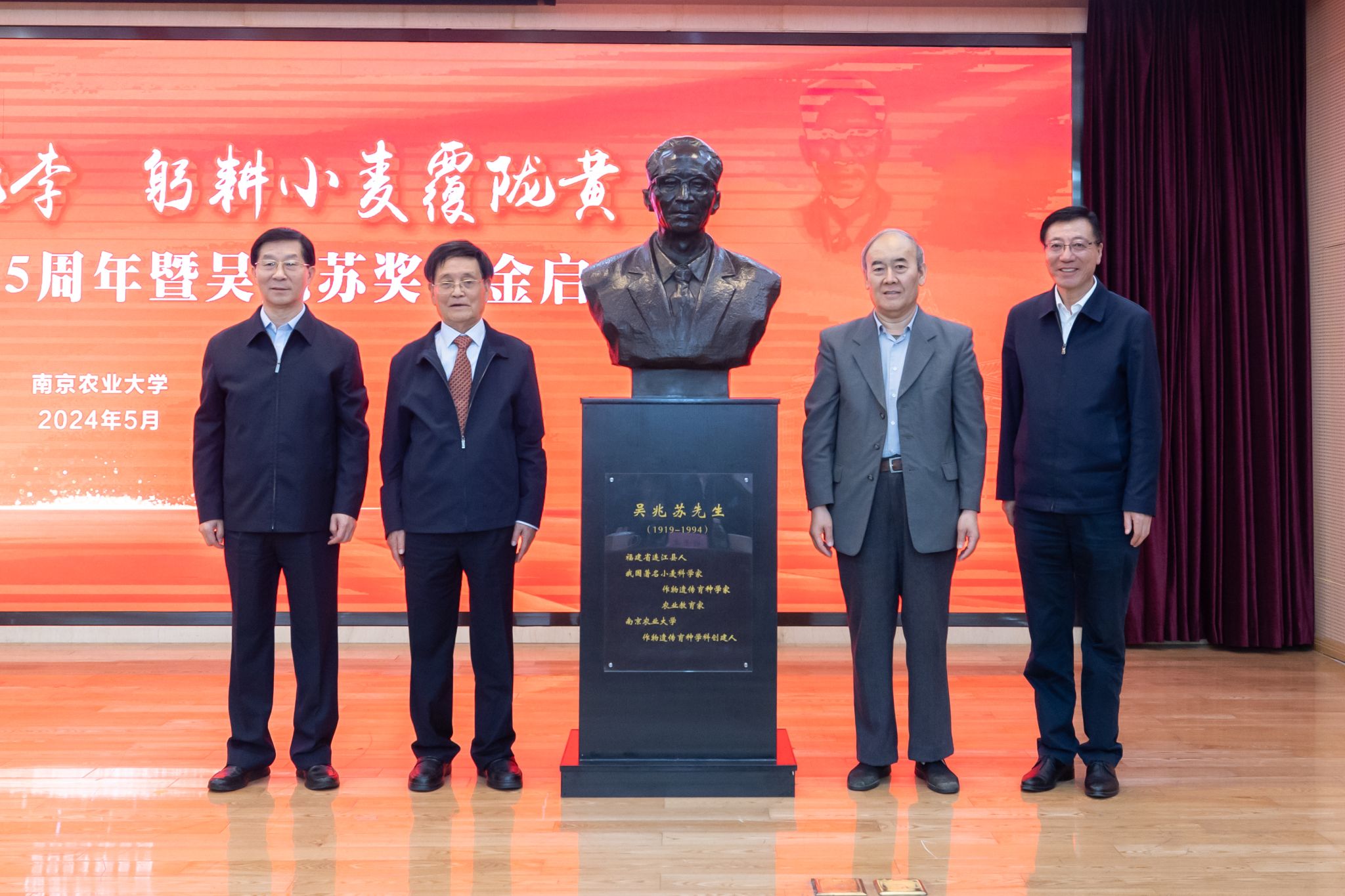 灌浆期的冬小麦正翻滚着绿油油的麦浪,大地即将变成一片金黄,预示着又是一个成熟的夏收。5月12日,为深切缅怀著名小麦科学家、作物遗传育种学家、农业教育家吴兆苏先生,传承弘扬吴兆苏先生“潜心科教、忠诚奉献、辛勤耕耘、正直坦荡”的品质,91自拍 举行吴兆苏先生诞辰105周年暨吴兆苏奖学金启动仪式。中国工程院院士、91自拍 教授盖钧镒,江苏省人大常委会原副主任俞敬忠,中国工程院院士、中国农科院研究员刘旭,中国工程院院士、中国农业大学校长孙其信,中国工程院院士、山东省农科院研究员赵振东,中国工程院院士、中国农科院研究员、91自拍 教授万建民,中国工程院院士、河南农科院研究员、吴兆苏先生弟子许为钢,全国政协教科卫体委员会副主任、自然资源部原副部长、江苏省原副省长、91自拍 教授曹卫星,江苏省政协原副主席、南京大学原党委书记胡金波,福建省政协原副主席、省残联第七届主席团名誉副主席、福建农林大学教授、吴兆苏先生弟子陈绍军,第十四届全国政协常委、甘肃省政协副主席、吴兆苏先生弟子尚勋武,安徽省政协副主席、安徽农业大学教授、吴兆苏先生弟子马传喜,江苏省农业农村厅一级巡视员、吴兆苏先生弟子唐明珍,91自拍 党委书记王春春、91自拍 校长陈发棣,校党委常委、副校长董维春、单正丰、朱艳,原副校长王耀南等领导专家出席活动仪式,吴兆苏先生海内外弟子,来自中国农业大学、西北农林科技大学、华中农业大学、山东农业大学、河南农业大学、安徽农业大学、山西农业大学、扬州大学、河南科技学院,中国科学院、中国农科院,江苏、山东、河南、四川、浙江、安徽、河北、湖北、黑龙江、云南、新疆、贵州等省市农林科研院所,中农发、中种等18家种业、粮农、机械有限公司的业内同行、专家领导与企业的负责人,91自拍 相关职能部门负责人,91自拍 党政班子全体成员,小麦遗传育种团队教师、学生和退休教师代表200多人参加活动。活动由董维春主持,期间,俞敬忠、刘旭、孙其信、曹卫星共同为吴兆苏先生铜像揭幕,全体参会成员行鞠躬礼。