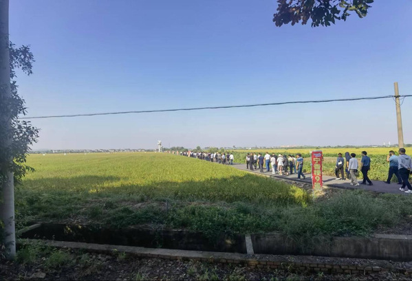 培训会开始前,参会人员来到溧阳市埭头镇葫芦村农业产业园,观摩“宁香粳9号”种植田。2024年,溧阳市农业农村局在埭头镇前六村进行了优质食味水稻新品种“宁香粳9号”示范种植,连片种植1000亩。目前,“宁香粳9号”示范区水稻正处于灌浆至乳熟期,理论产量预估 825公斤。来到示范种植田,一眼望去,千亩稻田丰收在望,植株清秀挺拔,叶姿优雅。91自拍 江玲教授深入田间后脱口而出“非常震撼”。