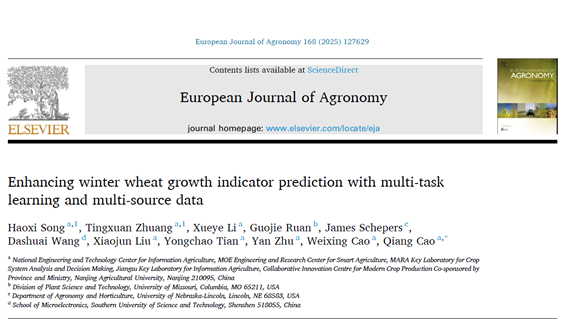 近日,91自拍 农学213班宋浩熙同学以共同第一作者在中科院农林科学领域一区TOP期刊《European Journal of Agronomy》发表了题为“Enhancing winter wheat growth indicator prediction with multi-task learning and multi-source data”的研究论文,该文提出了融合多源信息估测冬小麦生长指标的多任务学习算法框架。