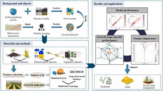 在全球人口持续增长与极端气候频发的双重挑战下,保障粮食安全并缓解气候变化影响的紧迫性愈发显著。作为全球粮食供给的战略性主粮作物,小麦全生育期的生长指标动态反映着作物健康状况与营养积累特征,因此提升其生长指标估测的精度与模型扩展能力已成为破解粮食安全困局的关键突破口。本研究基于河南省新乡市七里营试验基地连续三年田间定位观测数据,创新性地构建了融合光谱特征、水分参数及气象要素的多源信息集成框架,通过系统比较随机森林(RF)、长短期记忆模型(LSTM)与多任务学习模型(MTL)的预测效能,建立了冬小麦生长指标动态监测模型体系。研究发现,MTL模型在多个关键指标上呈现显著优势:其预测精度及运行效率较传统模型明显提升,并通过有效捕各生长指标的关联性,实现了多任务协同优化。特征重要性分析揭示,植被指数(VI)对生长指标的贡献度最大,水分参数以及具有累积效应的气象因子也对特定生长指标产生显著影响。本研究提出的多任务深度学习框架不仅增强了模型可解释性,更通过量化环境因子作用机制为精确管理调控提供了技术支撑。