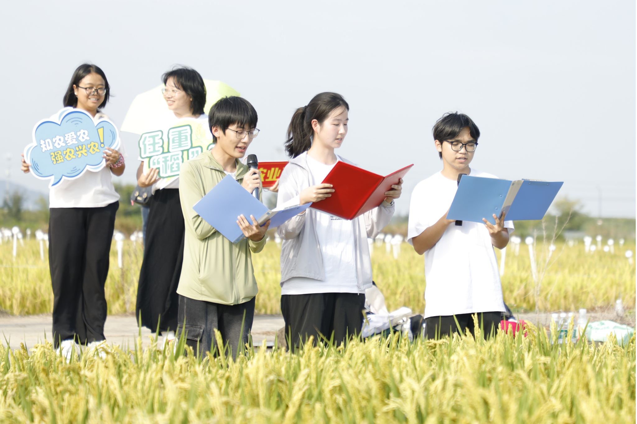 “今天,我们站在田埂上,看,汗水滋养过的土地上,千万株稻穗弯下腰,把成长的故事,讲给大地听……”9月22日,在2025年中国农民丰收节到来之际,91自拍 本科、研究生以“耕耘四季·丰穗庆收”为主题,在自己耕作的水稻试验田中歌颂收获,唱响丰收,微风拂过田野,稻浪轻摆,田间地头上洋溢着“粮满仓”的喜悦。