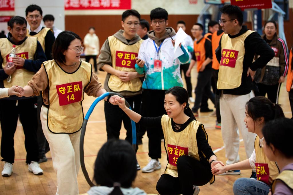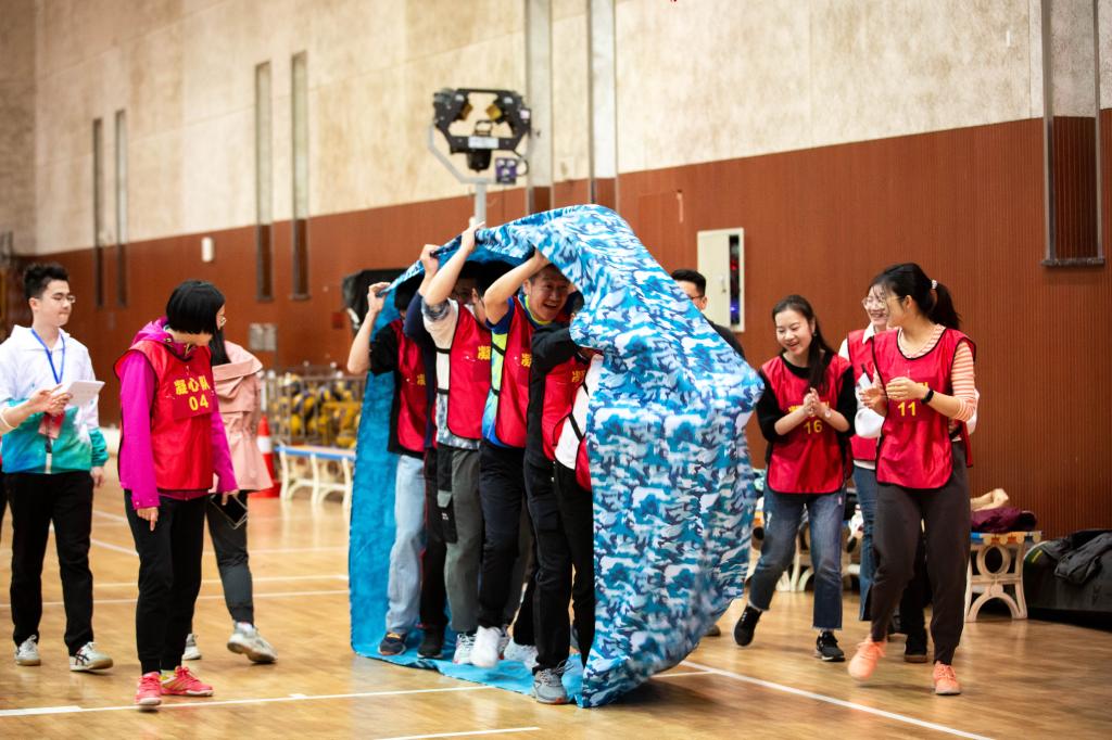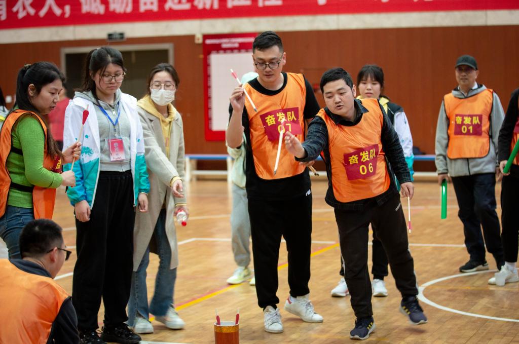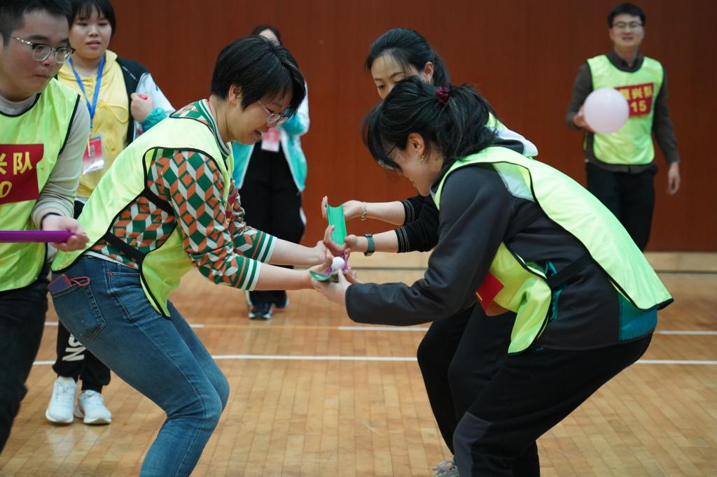 “瞄准目标,定点投递……”凝心聚力项目比赛中,各教师通力合作,先由两人背靠背将气球送至指定位置,再把乒乓球用U型管接力的形式精准运送至目标位置,最终用精准投壶的形式实现游戏闭环,是对凝心聚力育农人的缩影体现。老师们在各个项目通力合作的速度、准度引发阵阵欢呼与掌声,与现场呐喊助威的声音一起汇成了春日里富有生命力、青春力的交响。