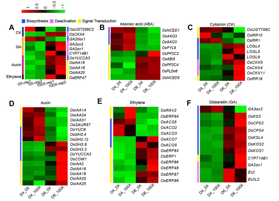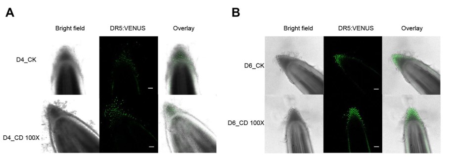 纳米材料已广泛应用于工业及医疗医药行业,而其在农业生产中的应用正受到广泛关注。目前,一种直径为2-5 nm的碳点(Carbon dots, CDs)纳米颗粒被认为是生物安全且环境友好型材料,在农业上具有潜在应用价值。已有研究表明,CDs能够影响植物生长发育,但其调控机制还有待进一步研究。本研究发现,适宜浓度的CDs预处理水稻种子明显促进了其根系及芽的生长。根系转录组分析结果表明,CDs处理诱导了根系部分生长发育以及激素通路相关基因的转录重编程;进一步实验证明,CDs处理影响了生长素在根中的活性及其空间分布,这些变化可能与CDs诱导的根表型变化有关。本研究为CDs如何通过转录重编程调控植物生长发育提供了一些新的见解。