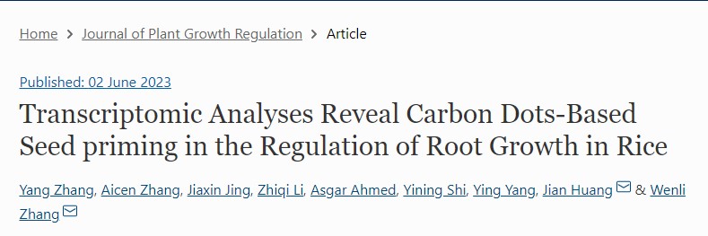 近日,91自拍 三名本科生张阳、景嘉欣、李智奇以共同第一作者在《Journal of Plant Growth Regulation》杂志发表了SRT研究结果,研究论文题目为“Transcriptomic analyses reveal carbon dots-based seed priming in the regulation of root growth in rice”,该研究初步探究了纳米预处理对于水稻根系生长发育的影响及其潜在调控机制。