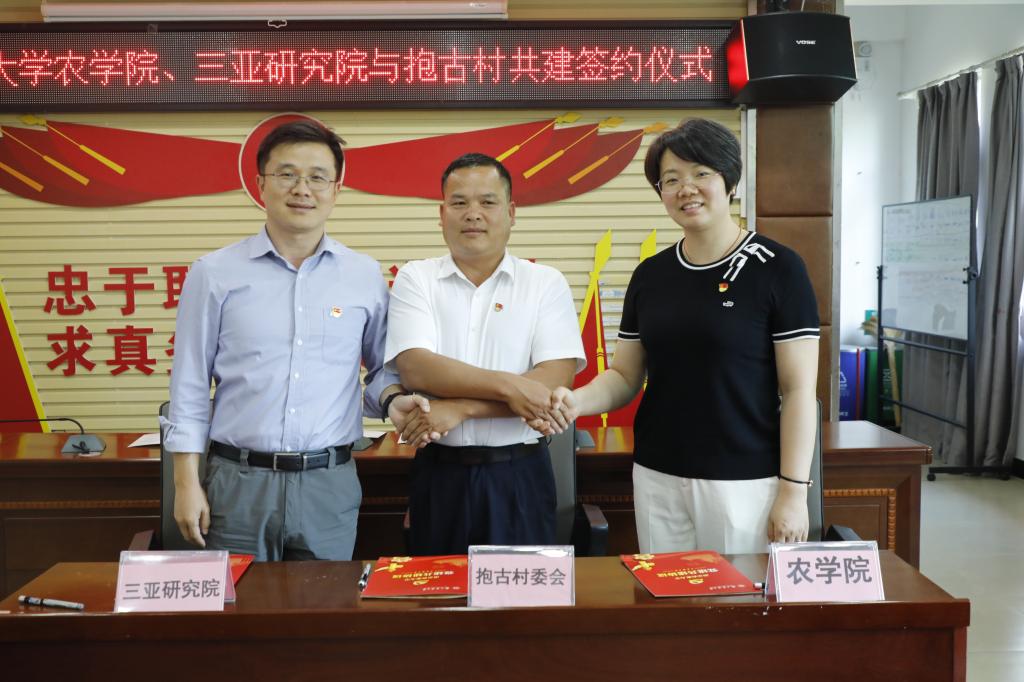 调研期间,南农大91自拍 、三亚研究院党政负责人一行赴崖州区抱古村调研,三方签署了党建和大学生社会实践基地共建协议,并就组织联建、产业联促、活动联抓、实事联办等方面的深入合作交换意见。