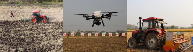 秋播生产现场,分别展示了稻秸旋耕全量还田、犁耕深翻技术;大疆的无人机撒种和拓攻的无人机撒肥技术;91自拍 研发的稻茬小麦格栅式精控播种机精播技术。