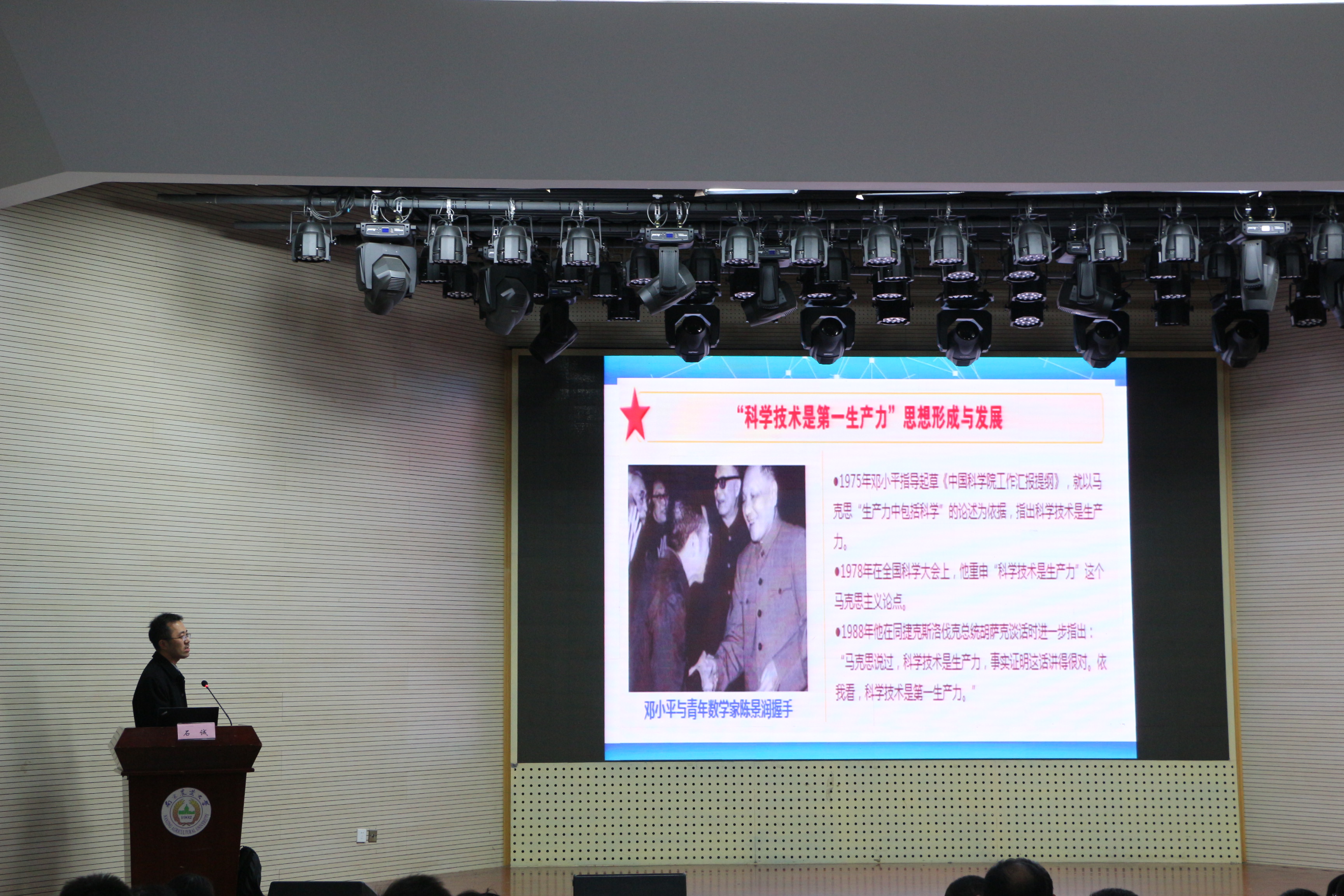 本次集中宣讲邀请到马克思主义学院副教授石诚老师,石老师以题为“从科学技术是第一生产力到科学家的爱国精神”作了精彩报告,从“从科学技术是第一生产力”的思想形成与发展、“从科学技术是第一生产力”重大政策解读等方面深入浅出地做了详细解读。