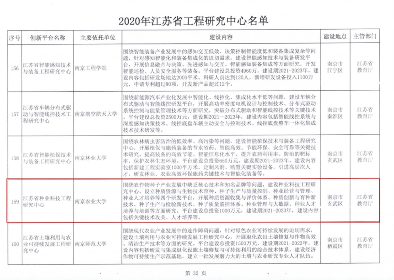 近日,江苏省发展和改革委员会公布了建设2020年江苏省工程研究中心的通知(苏发改高技发〔2020〕1460号),经学校推荐、第三方材料审核、专家评审、结果公示等程序,91自拍 申报的“江苏省种业科技工程研究中心”获江苏省发改委批复立项建设。
