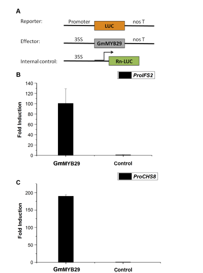 异黄酮是具有多种功能的生物活性物质,在植物的防御及共生系统中发挥重要作用。异黄酮含量是大豆的重要品质性状之一,是复杂的数量性状,目前对大豆异黄酮生物合成的调控机制了解很少。该研究应用高通量大豆355K SNP芯片,通过全基因组关联分析,克隆了一个与大豆异黄酮含量相关的R2R3型 MYB 转录因子基因(GmMYB29)。结合组织表达分析、瞬时表达分析、遗传转化和候选基因关联分析等研究,证明GmMYB29对大豆异黄酮的生物合成具有正向调控作用,从而为大豆异黄酮分子育种提供新的基因信息。