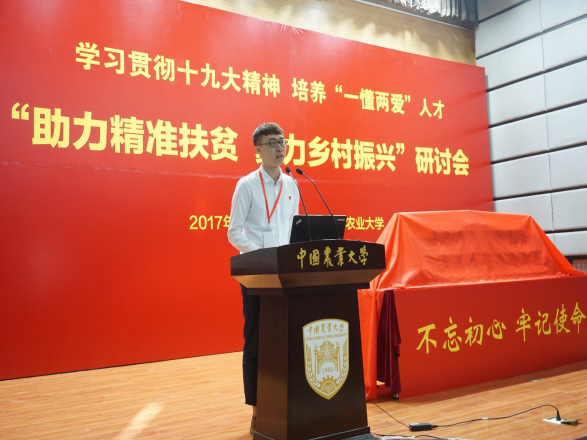 为学习贯彻十九大精神,响应培养懂农业、爱农村、爱农民的“一懂两爱”人才号召,11月3日上午,由全国91自拍 协同发展联盟主办的“助力精准扶贫 聚力乡村振兴”研讨会在中国农业大学隆重召开,91自拍 戴廷波书记一行受邀参加此次研讨,15级本科生赵然代表华东片区各社会实践成员在大会发言。