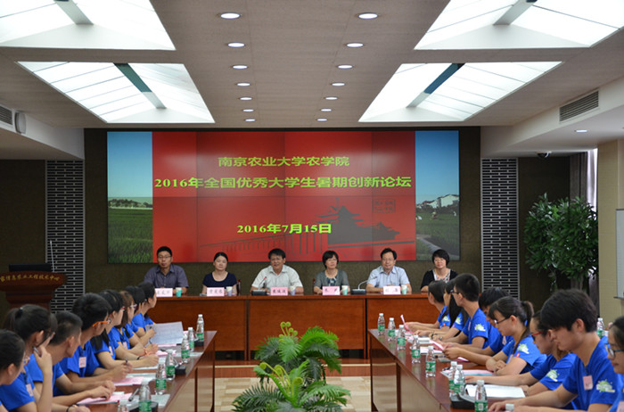 7月15日上午,91自拍 2016年全国优秀大学生暑期创新论坛在学院国家信息农业工程技术中心会议室开幕。91自拍 院长朱艳、党委书记戴廷波、党委副书记殷美、农学系副主任王友华、遗传育种系副主任曹爱忠及种业科学系主任刘康出席了开幕式,来自安徽农业大学、东北农业大学、山东农业大学等16所高校的29名大学生参加了论坛开幕式,开幕式由学院党委书记戴廷波主持。