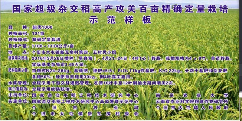 新瓦房村是国家杂交中心云南高原粮繁分中心(简称高原分中心)的高产攻关基地,自然条件优越。高原分中心一直在此进行“超优900”和“超优1000”等杂交稻的高产攻关,但由于缺少配套的栽培技术,难以突破900公斤/亩。2013年,受高原分中心盛情邀请,91自拍 水稻栽培组与云南省农科院开始在个旧新瓦房村进行高产攻关。示范前根据土壤、生态和品种特点,进行栽培方案精确设计;长期派驻研究生进行数据采集和技术落实。通过几年的技术攻关和示范,技术优越性迅速得到当地农民认可,技术到位率逐步提高。产量逐年实现突破,由2013年的901.95公斤/亩,2014年的946.5公斤/亩,突破到2015年的1067.5公斤/亩和2016年的1088公斤/亩。