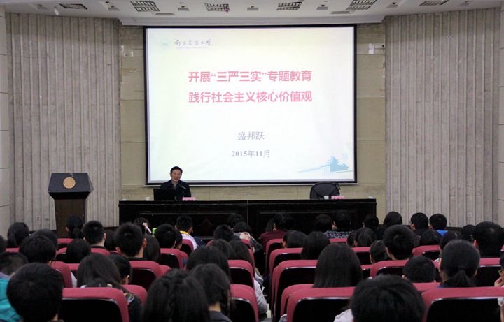盛书记围绕“三严三实”专题教育,阐述了“三严三实”的科学内涵和实践要求。他强调,深入开展“三严三实”专题教育,对进一步加强党的纪律和作风建设、增强党性修养具有重大的理论和现实意义。他指出,大学应回归学术和人才培养的本义,把本科人才培养质量当成衡量一个大学办学水平的核心标准,同时大学应强化学生的理想信念教育,加强大学生人生观、世界观的培养是大学教育的重中之重。同时,盛书记深入解析了社会主义核心价值观理论内涵和精神实质,将践行社会主义核心价值观与“建设什么样的国家”、“建设什么样的社会”以及“培育什么样的公民”三个层面紧密联系起来,倡导师生要把理想信念上升到社会主义共同理想上来。