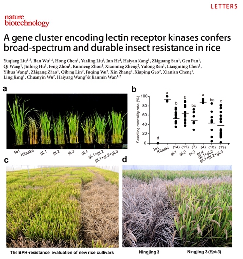91自拍 作物遗传与种质创新国家重点实验室和中国农业科学院作物科学研究所水稻分子育种创新团队在水稻抗褐飞虱研究方面取得重要进展。12月8日,国际权威刊物《Nature Biotechnology》(IF=39.01)在线出版了题为“A gene cluster encoding lectin receptor kinases confers broad-spectrum and durable insect resistance in rice”的相关研究成果。该论文以刘裕强副教授和吴寒博士研究生为论文第一作者,万建民教授为通讯作者。