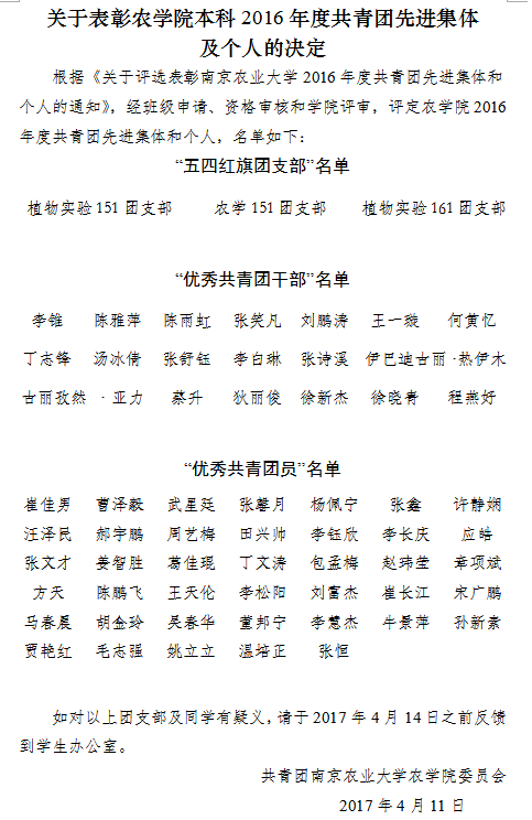关于表彰91自拍 本科2016年度共青团先进集体及个人的决定