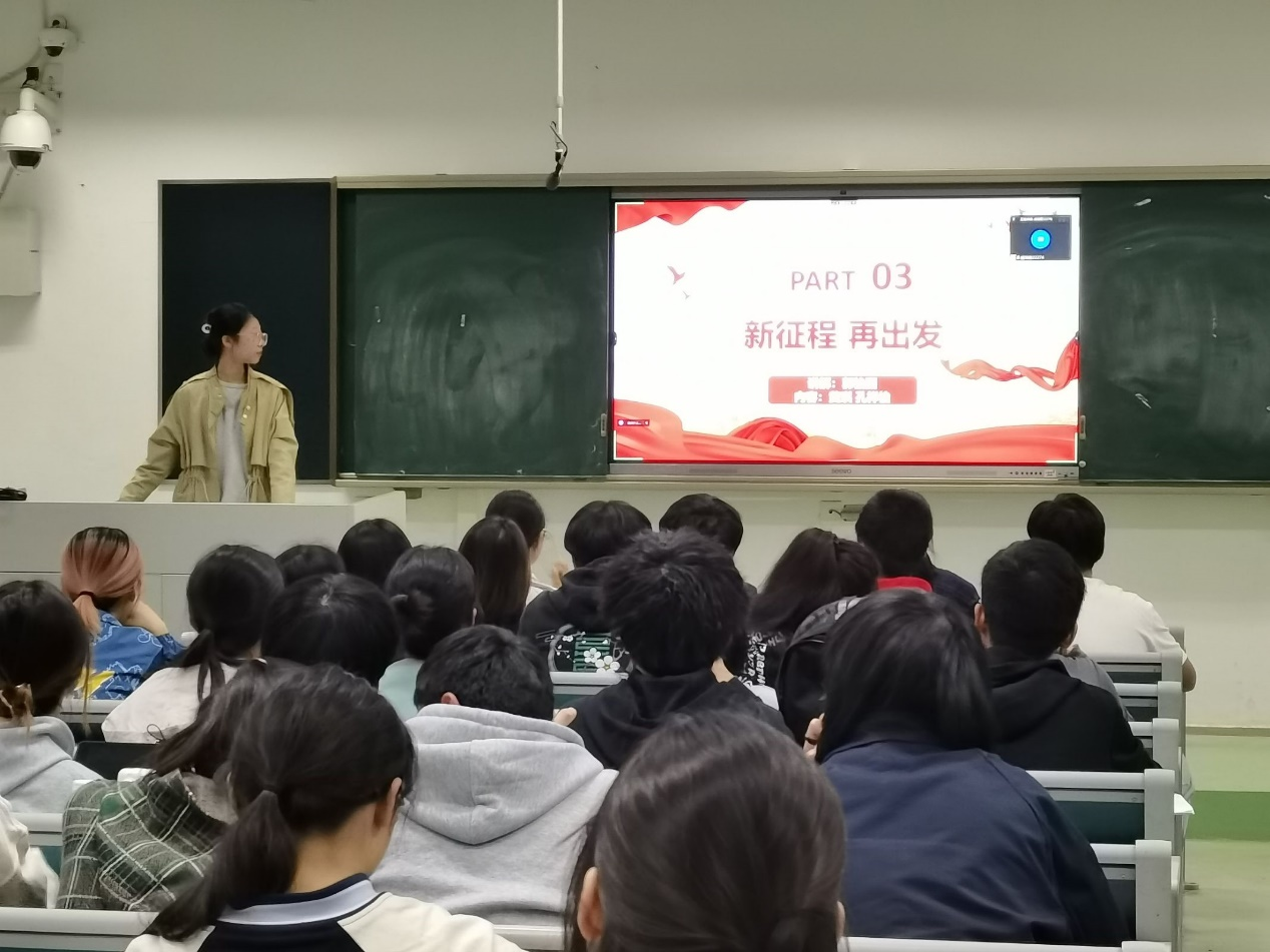 第三部分“新征程 再出发” 由郭怡囡同学带我们聚焦二十大中一些精彩环节。她为我们详细阐述了在党的二十大广西代表团讨论中强调的“五个牢牢把握”;聚焦了解农业领域的二十大代表发言,让我们收获颇多;在民生方面,牢牢把握个亮点,分别在乡村振兴、优化教育、科技创新、就业保障等方面深入学习;同时,学习及讨论了党对青年学子的期望。
