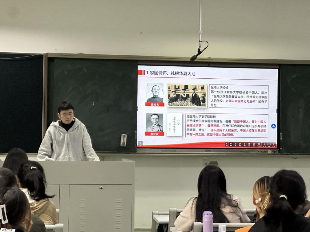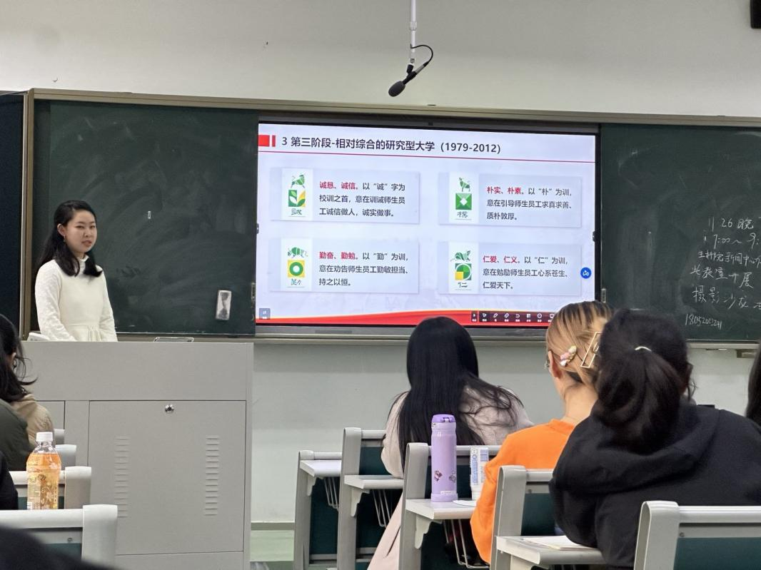 第一部分“校史沿革,固坚实之基”由林少锋同学和施崇瑾同学主讲。林少锋同学为我们介绍了南京91自拍 的前身以及动荡中的91自拍 ,详细介绍了中央大学的西迁往事、历史上南农的重要地位以及可敬可爱的南农人,通过历史事件让我们了解到前辈们的重要影响。学习了一些基本知识后,大家活跃参与知识问答环节。