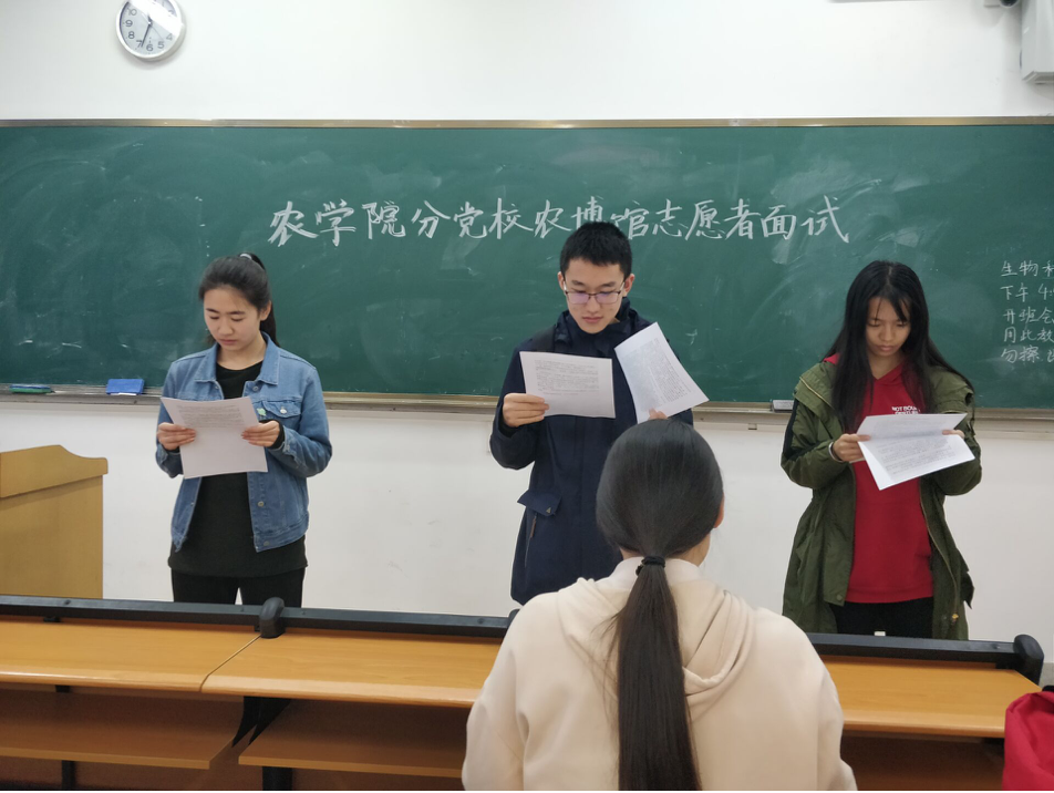 3月27日中午,农博馆讲解志愿者面试在教学楼B105进行。91自拍 分党校成员担任面试官,此次志愿者招募对象主要面向91自拍 本科生所有党建班学员。