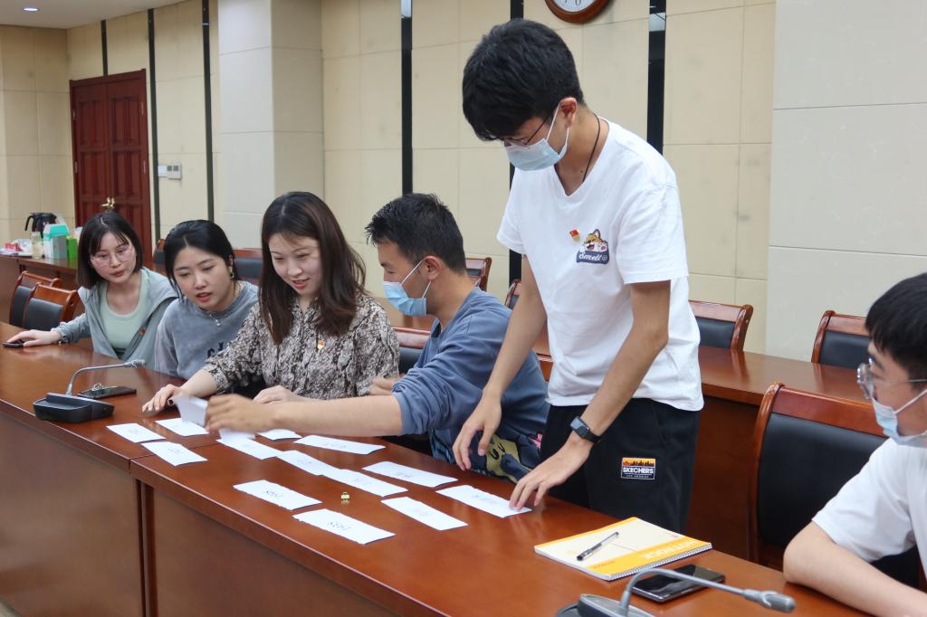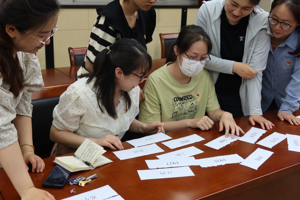 拼接红色记忆卡片,铭记百年奋斗党史。支部采取了互动游戏的形式,准备了三类“记忆卡片”,分别标注“历史时间”、“历史地点”和“历史人物”。党员们分组进行比拼,在规定时间内拼出正确历史事件最多的小组获胜。比拼结束后,吴文轩对游戏中提及的历史事件进行了讲解,带领党员们重温了中国共产党党史。