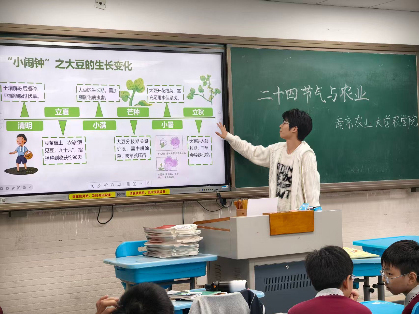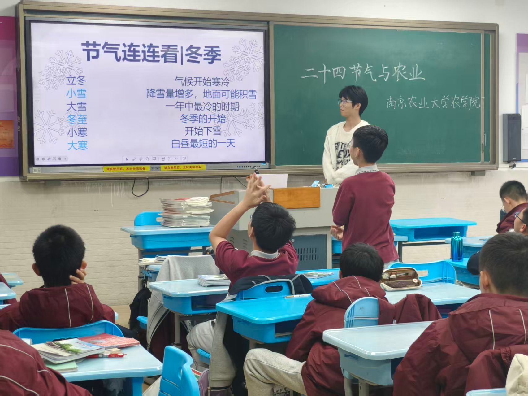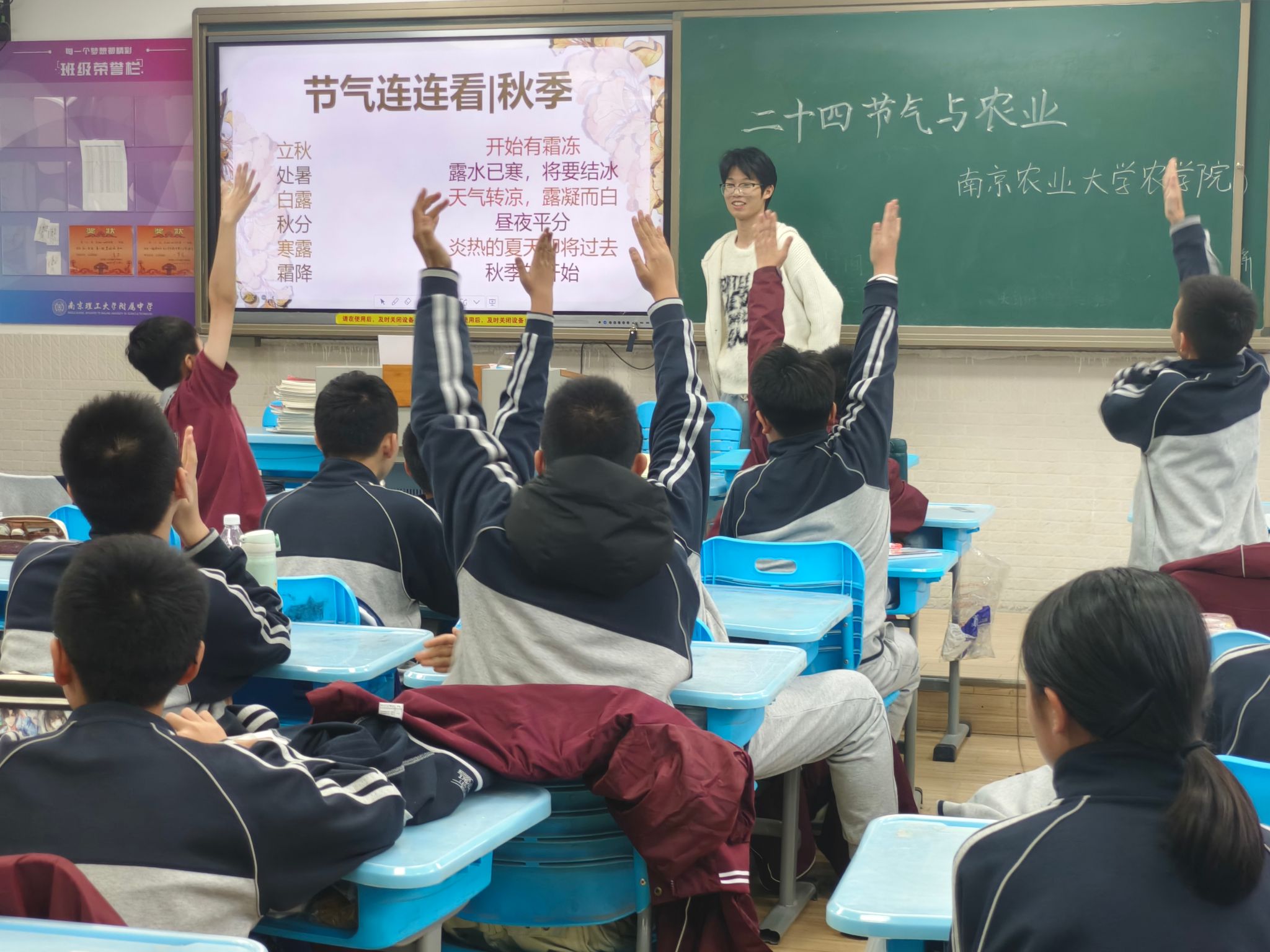 为传承中华优秀传统文化,帮助学生理解古人智慧与现代农业的关联,10月24日,一场主题为“天地节律,农耕密码——解码二十四节气”的科普课在南京理工大学附属中学精彩开讲。91自拍 “听秾说”科普团队的志愿者们以生动的内容、鲜活的案例,带领同学们走进二十四节气的世界,感受传统智慧与现代科技的碰撞。