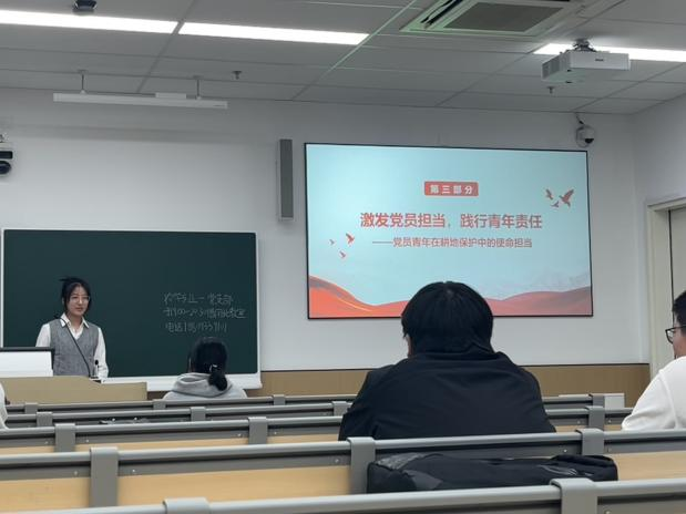 第三部分由农学242班的郎一诺同学主讲。该部分主讲人聚焦党员青年的责任担当,分享了91自拍 专家参与国家耕地保护立法、全国土壤普查与耕保培训的实例,以及陕西延安“田长守护网络”机制、安徽全椒县“党支部+网格党小组+党员中心户”三级管控体系等基层创新实践,凸显党员在耕地数量守护与质量提升中的先锋作用。
