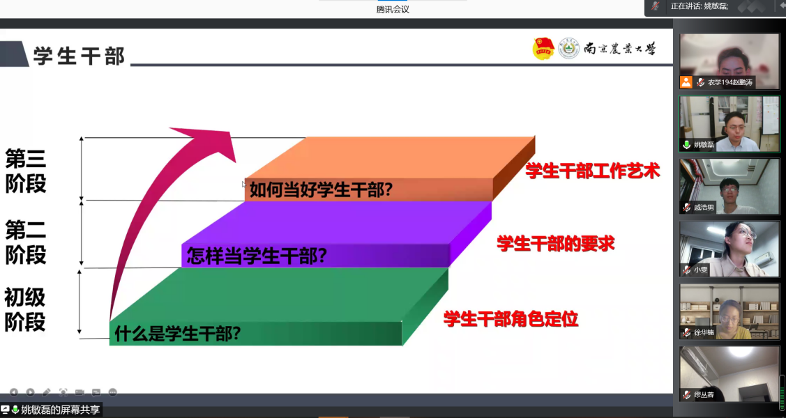 9月15日晚,91自拍 2021-2022学年学生组织主要学生干部系列培训在腾讯会议平台顺利举行。校团委宣传部部长姚敏磊老师以“学生干部请就位”做主题分享,本科生辅导员孙小雯、2021-2022学年学生组织主要学生干部全体参加会议,会议由现任主席团成员赵鹏涛主持。