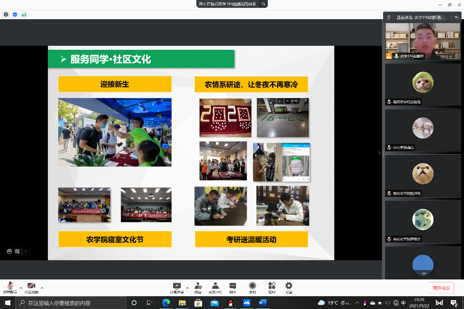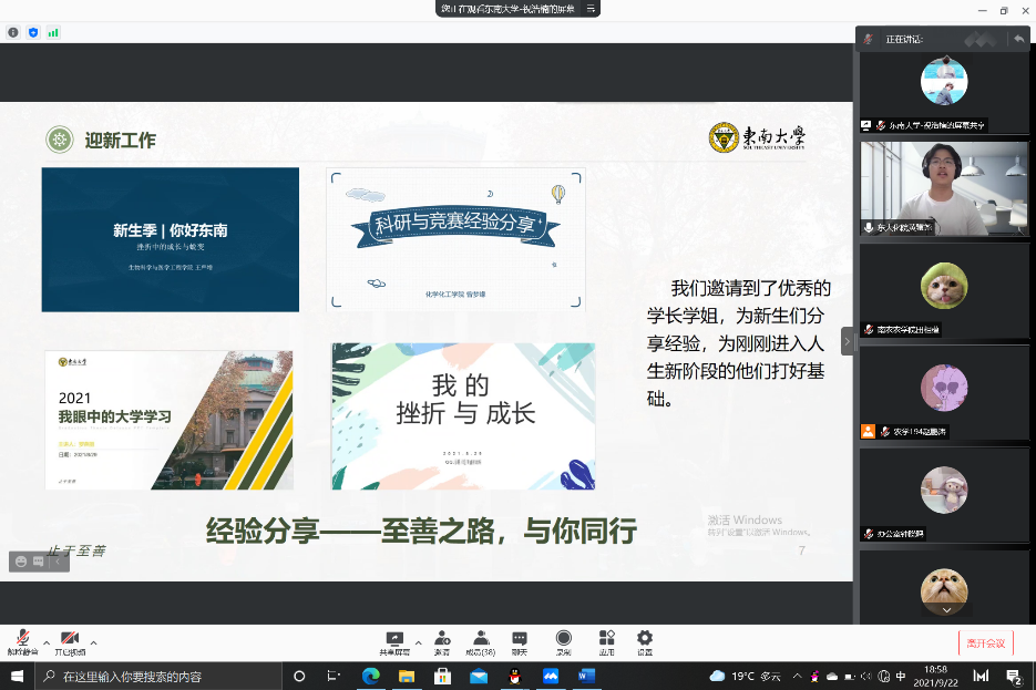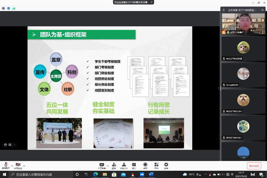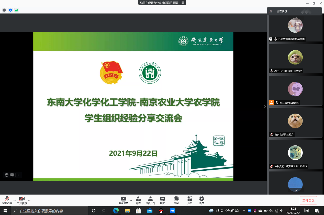 9月22日晚,91自拍 与东南大学化学化工院2021-2022学年学生组织主要学生干部通过腾讯会议开展了线上经验交流分享会,化学化工学院辅导员楚俊卿、91自拍 本科生辅导员孙小雯、2021-2022学年91自拍 和东南大学化学化工学院学生组织主要学生干部全体参加会议,会议由主席团成员查欣妍主持。