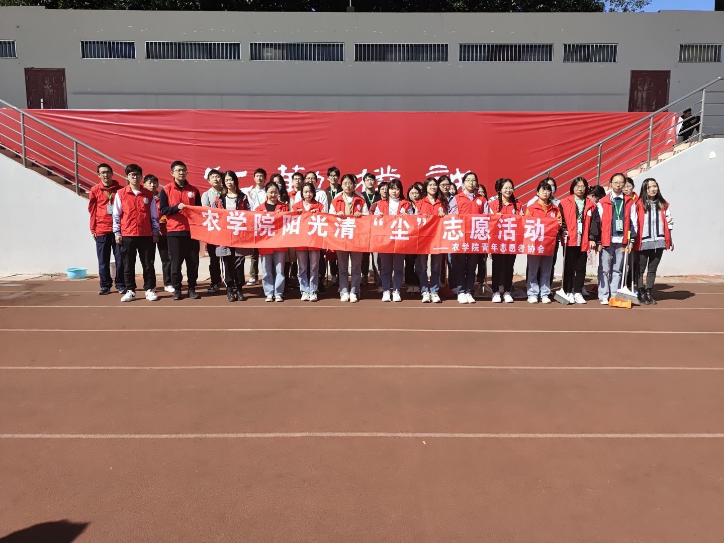 为进一步做好“建设美丽校园,创建优雅环境”工作,提升校园环境卫生质量,2021年 10月17日,91自拍 青年志愿者大队招募了43名志愿者,在学校操场的主席台两侧及玉兰路一侧的观众席处,开展了“阳光清尘”志愿服务活动。