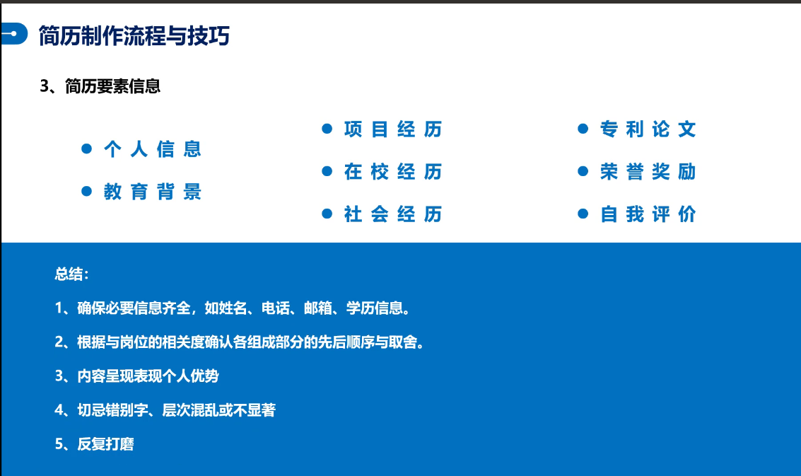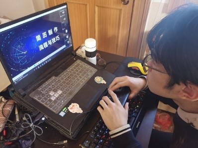 赵世萍以简历制作为切入点,从“认识自己”与“认识企业”方面介绍了简历的作用与价值,由此告诉同学们简历上应包含的内容与重点突出的信息。赵世萍讲道,认识自己即需要挖掘自己的潜力与价值并在简历中展示给面试官,同时强调自身潜力的体现并一定体现在参与的大型活动中,也可以是做生活中的一些小事时所体现的责任感与奉献精神。