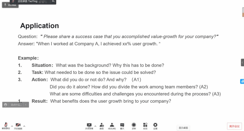 陶婷以面试为切入点为大家介绍了面试官面试时重点关注的内容与面试问题背后的含义与考察点,并在线上与参会人员做了问答模拟,让同学们有了一定直观认知。