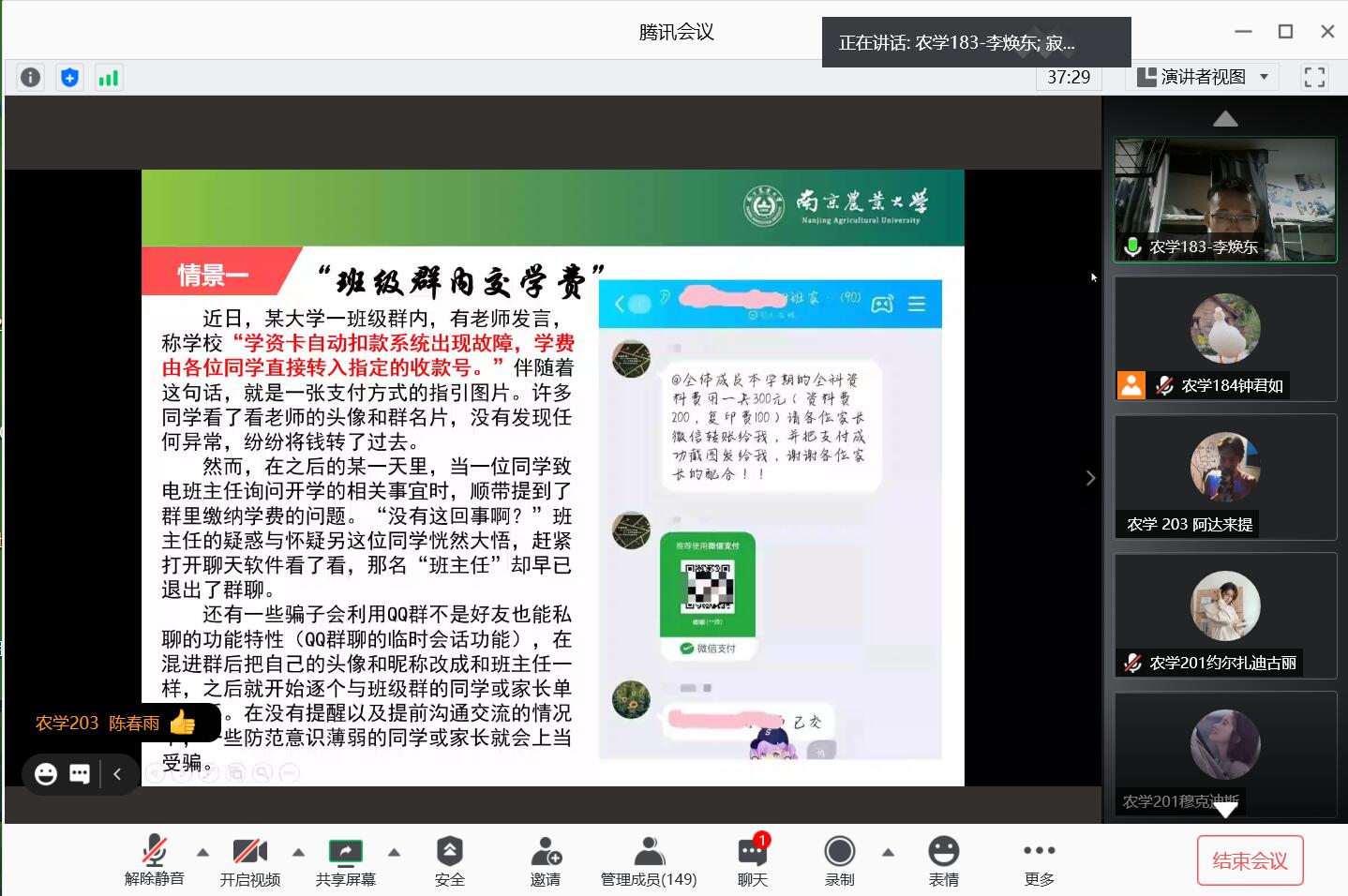 李焕东从“发现危害自身安全的情况怎么办?”、“校园贷的骗局是什么?”、“‘很真’的诈骗情形还有哪些?”、“校园自我保护经验分享”四个方面展开讲解,向新生们介绍常见的校园骗局和防范要点。为了使同学们更好地理解并重视这一问题,李焕东通过生动的角色扮演、自身的受骗经验教训和许多真实的案例展现了各种需要提防的骗局和危险场景。同学们在感叹骗术五花八门的同时,表示“一定要加强警惕,好好保护自己”。在课堂上,李焕东也邀请不同的同学为大家朗读案例,其他同学们则在会议软件的信息框中进行提问和讨论,互动非常充分。