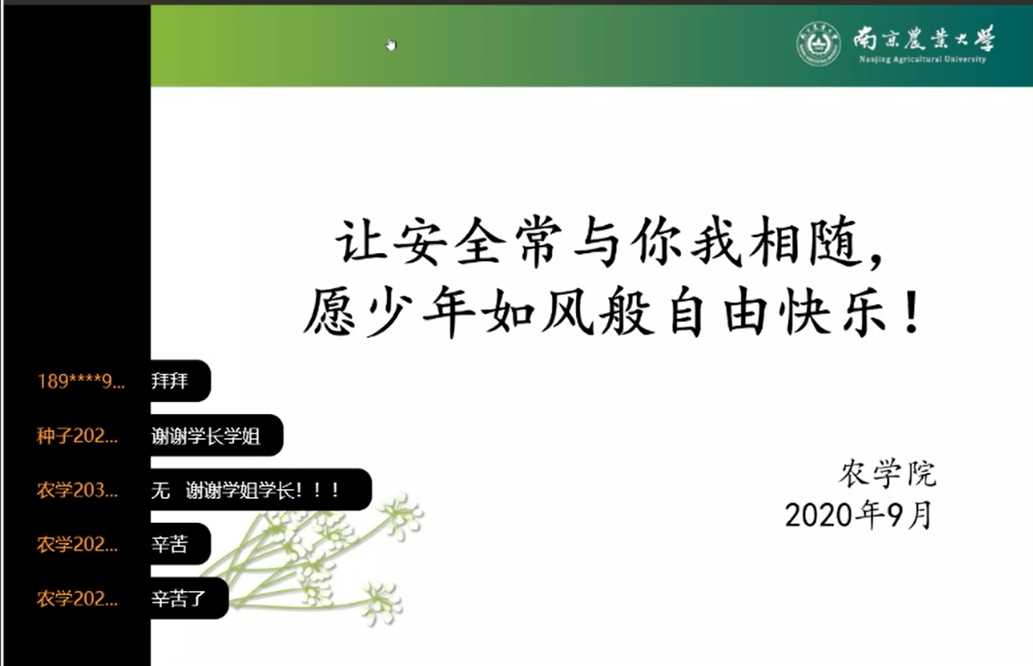 9月17日上午,91自拍 2020级新生因军训遇雨,在宿舍通过线上视频会议的方式上了一堂妙趣横生的安全教育课。课程由农学203班团务助理李焕东主讲,91自拍 学生团委副书记钟君如主持。