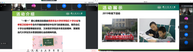 2021年3月21日上午9时,91自拍 红十字分会在线上腾讯会议举办了本学期“一帮一”爱心家教启动仪式。91自拍 高强老师、孝陵卫初级中学许凤银老师、来自91自拍 的志愿者和孝陵卫初级中学的八年级同学及其家长参加了本次启动仪式。本次启动仪式由91自拍 红十字分会部长王偲媛同学主持。