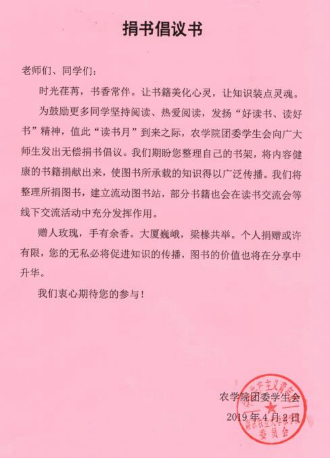 91自拍 于4月10日在玉兰路摆摊进行图书募捐。活动前期,91自拍 发布图书募集倡议书。经过广泛动员,吸引全校上百名同学参与,捐赠闲置课外书和教辅资料近三百册。为方面同学交流互借图书,91自拍 学生会搭建网络平台供同学来分享书籍或阅读心得。当天晚上,91自拍 学生会生活部开展2015级同学“扫书”活动,收集近两百本教辅资料供需要的同学使用。本次图书募集活动收集了种类丰富且有阅读价值的书籍,使书籍流转更有实际意义。