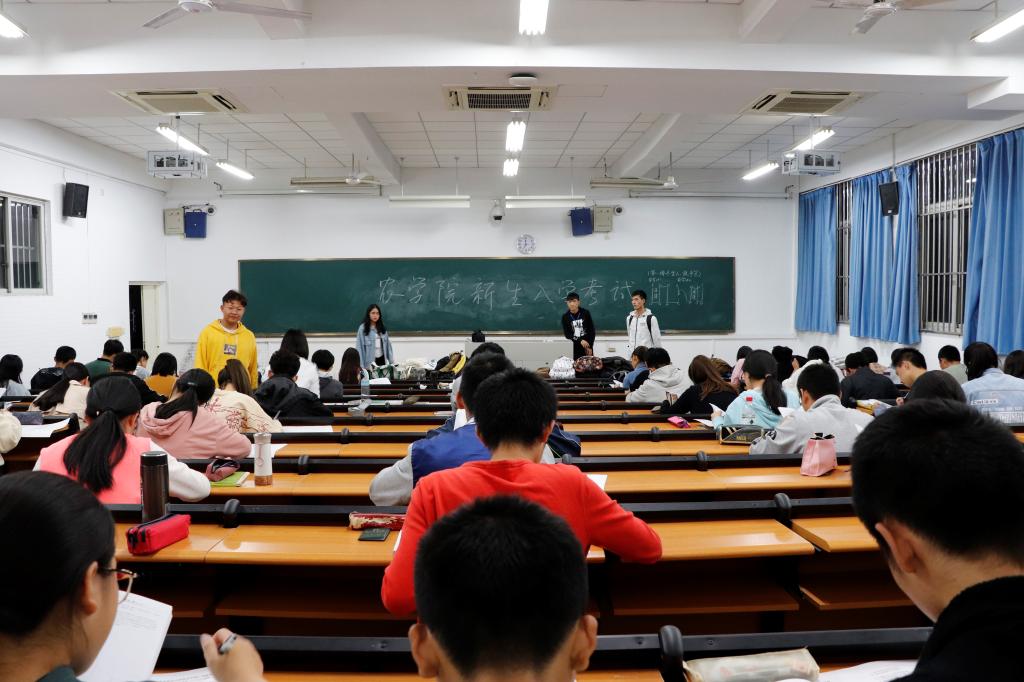 考试开始前,监考人员讲明考试注意事项。新生们认真答卷。监考人员检查考生证件,核对学生名单。
