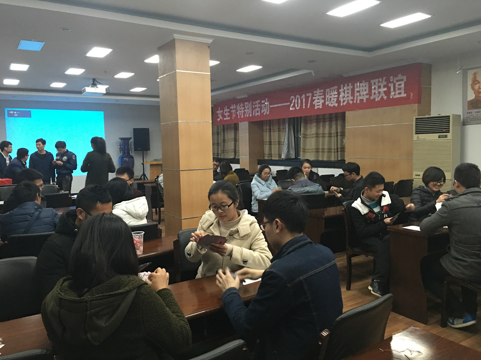 为了丰富研究生课余生活,响应校研会“社区文化节”活动的号召,让更多同学积极参与到丰富多彩的校园文化生活之中,3月7日晚上,91自拍 与人文与社会发展学院在91自拍 报告厅举办了“女生节特别活动——2017春暖棋牌联谊大赛”。此次活动的参与对象为全校研究生。本次联赛主要分为三个部分进行:掼蛋大赛,五子棋大赛和象棋大赛。